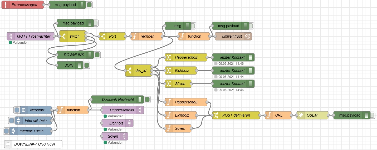 Die in der Nähe befindlichen Gateways empfangen jetzt weiterhin die Daten der Stationen und leiten diese nun in die neue Cloud. Von dort werden die Messwerte wieder abgeholt, entschlüsselt und durch eine node-red Instanz zur Aufbereitung geschleust. Aktuell werden dann die Messwerte nur in einer influx-Datenbank gespeichert und könnten von dort aus mit grafischen Tools wie „Grafana“ entsprechend aufbereitet und dargestellt werden. Eine Anpassung der Datenverarbeitung beim Bauhof ist auch in Vorbereitung – per MQTT werden die Daten aus der Cloud dann auch von den Mitarbeitern abgeholt, aufbereitet und können dann bei Bedarf die Entscheidung unterstützen, einen Einsatz auslösen. Vorteile im konkreten Beispiel der Frostwächter ist nachhaltige, ressourcen- und umweltschonende Dienstleistung durch den Einsatz der Streufahrzeuge nur bei tatsächlichem Bedarf.